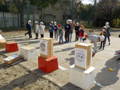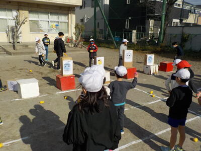 体育委員が企画して、業間休みの時間に、「投げる力」をつけるために的当てを行っています。来年の体力テストには結果が出ることを期待しています。