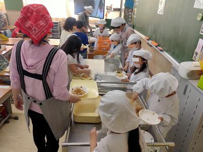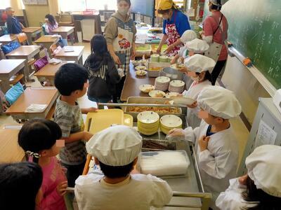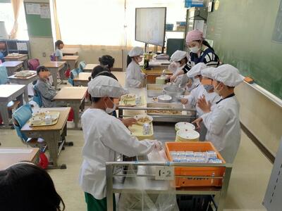 1年生が給食を準備している様子です。給食当番が一生懸命準備をしていました。