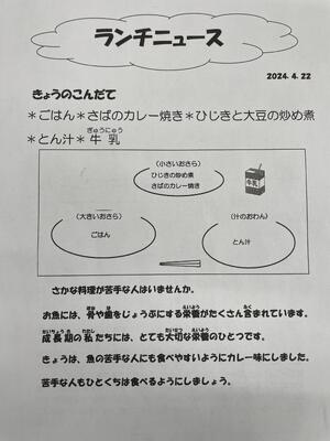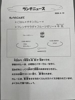 一年生のはじめての給食メニューはカレーでした。午前中、給食室からスパイシーなにおいが漂ってきて、「おなかすいた。」という声が聞こえてきました。配膳のきまりを確かめながら活動していました。これからの給食が楽しみですね。