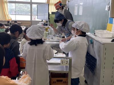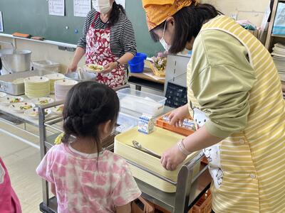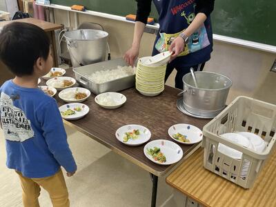 初めて給食当番として配膳をしました。役割をよく理解して活動することができました。これから当番の順番が回ってくるのが楽しみですね。