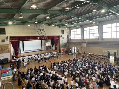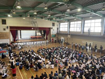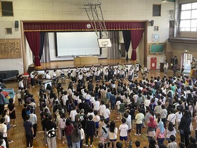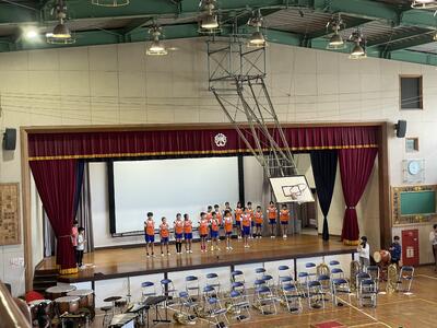 体育館で前期終業式を行いました。校長先生から、前期の生活や学習を振り返るお話があり、子どもたちは自分事として考えながら聞いていました。今日は通知表を持ち帰ります。ご家庭でも前期のできたところを褒めていただき、後期に向けためあてについて話し合ってみてください。