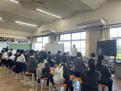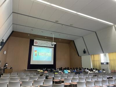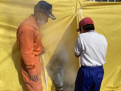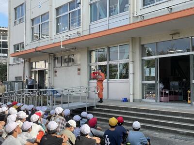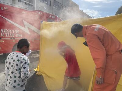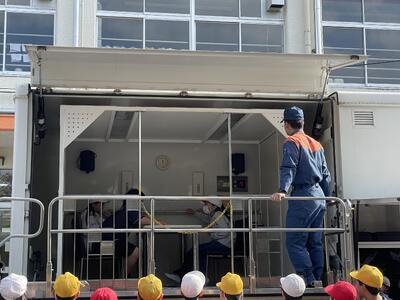 消防署の方をお招きして、煙中体験と起震車体験をしました。煙中体験では、煙の中は前が見えにくいことやハンカチや姿勢を低くすることの必要性を実感できました。また、起震車体験では、過去の地震の揺れの怖さを体感しました。消防署の皆様、貴重な体験をさせていただきありがとうございました。