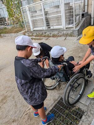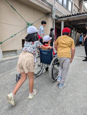 社会福祉協議会の皆さんをお招きして、車椅子体験をしました。実際に押したり乗ったりすることで、利用する方の立場に立って考えることができました。お手伝いいただきました皆様、丁寧に教えていただきありがとうございました。