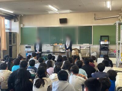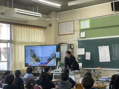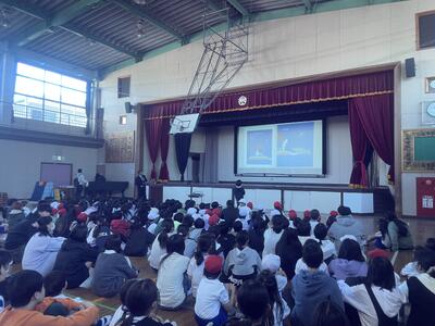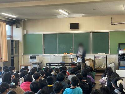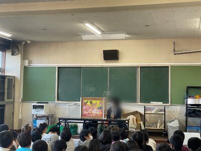 中央図書館の方をお招きして、お話会を開きました。紙芝居やブックトークを含めた5冊を読み聞かせていただきました。本に関する実物も提示しながら説明していただき、子どもたちは興味を示していました。