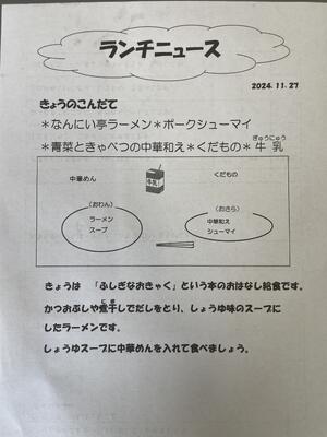 今日の給食は、読書月間の取組の一つ、お話給食でした。なんにい亭ラーメンはおだしの香りがして、おいしかったです。子ども達は、お昼の放送で本が紹介されると、嬉しそうに食べていました。