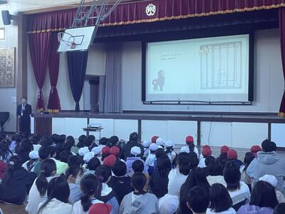 読書月間の取組の一つとして、校長先生による読み聞かせを行いました。クイズを中心にした本で、解答を予想しながら聞き、みんなで盛り上がりました。今度は2•4•5年生に向けて読み聞かせがあります。楽しみですね。