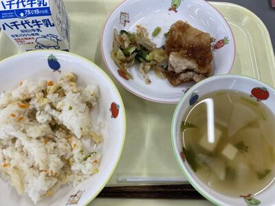 今年度初めての給食でした。春の香りがする献立でした。栄養士さん、給食室のみなさん、今年度もおいしい給食を楽しみにしています。よろしくお願いします。