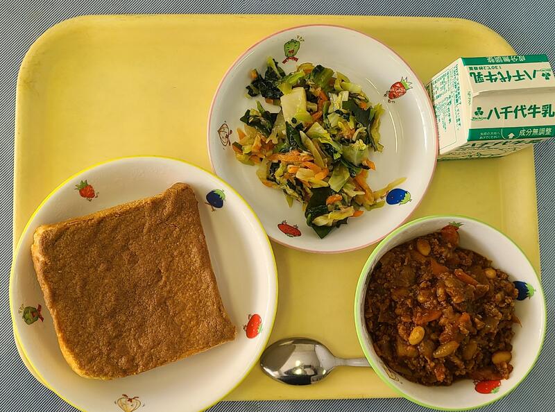 献立は、きな粉トースト、牛乳、チリコンカン、海藻サラダ、です。