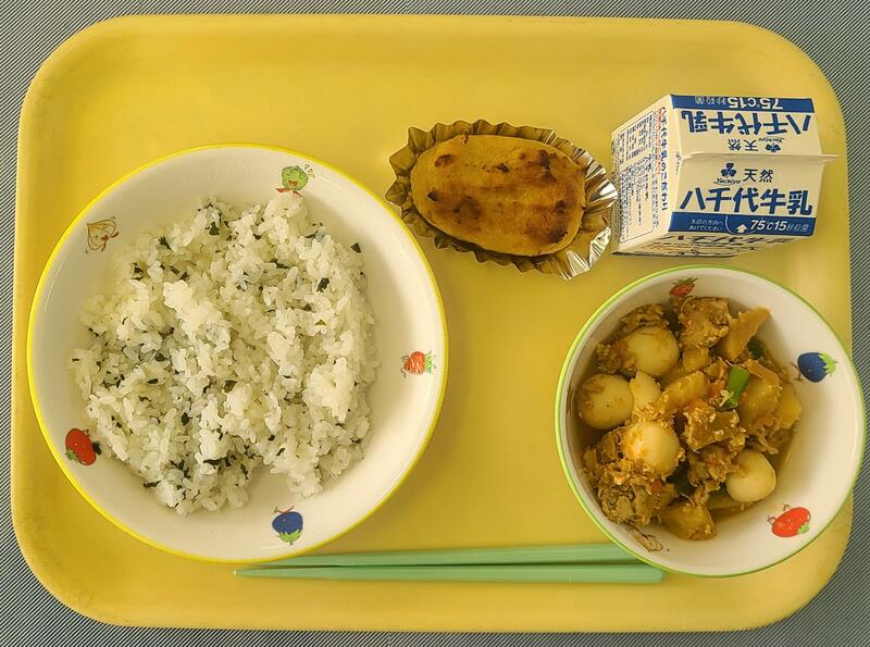 献立は、しらすわかめご飯、牛乳、五目うま煮、スイートポテト、です。