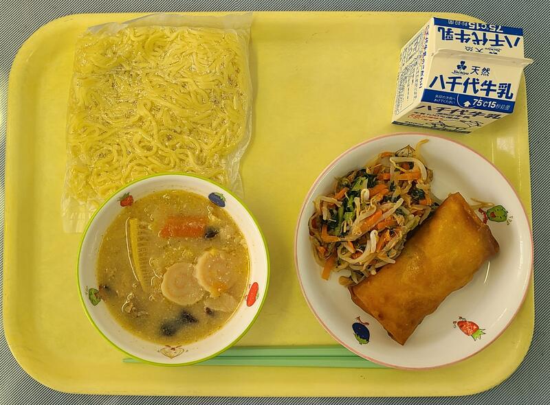 献立は、ちゃんぽん、牛乳、ウインナー春巻、中華サラダ、です。