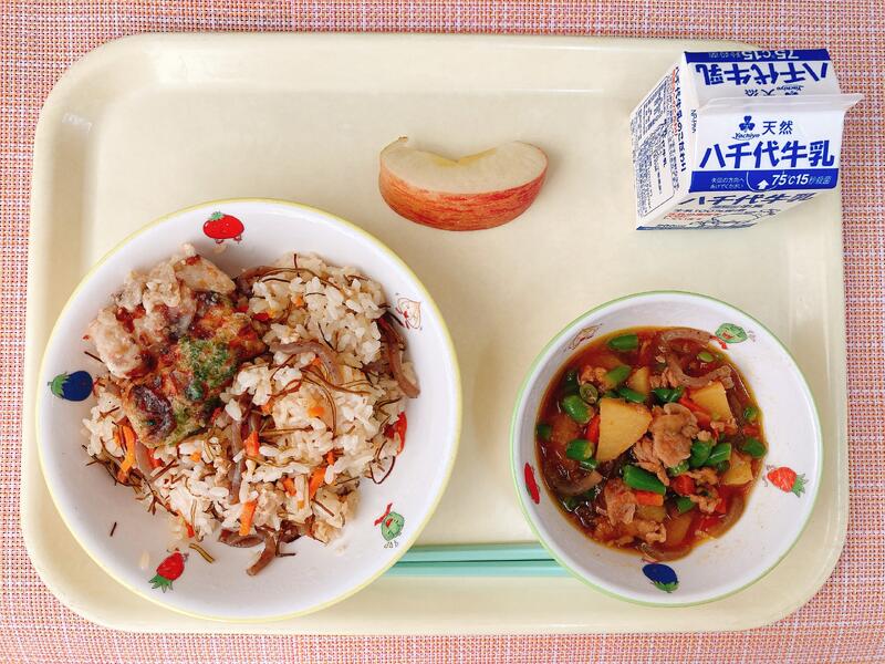 献立は、昆布ご飯、牛乳、ちくわの二色揚げ、肉じゃが、りんご、です。