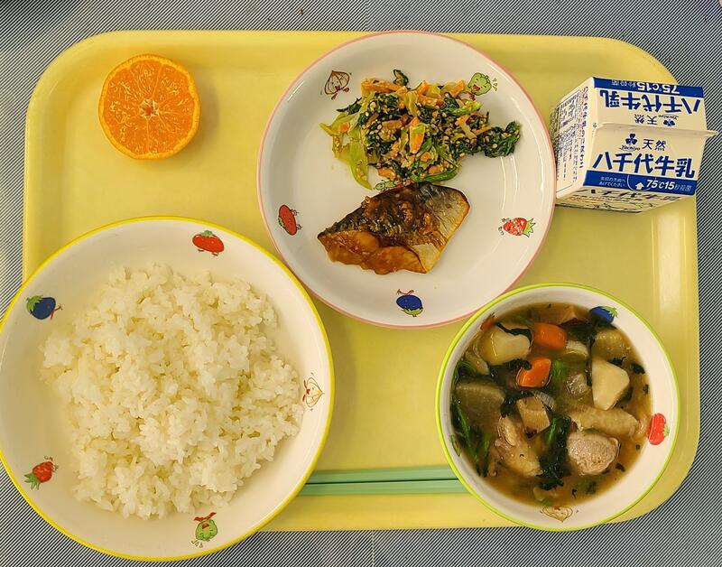 献立は、ご飯、牛乳、鯖の葱味噌焼き、ごま和え、治部煮、花みかん、です。