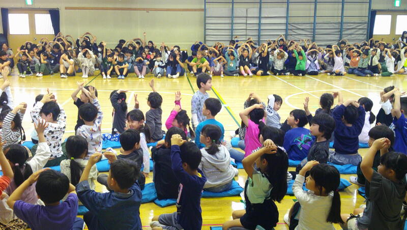 この日の訓練では、まず「シェイクアウト訓練」を行いました。これは、避難行動1・2・3ということで、1 まず態勢を低く→ 2 頭を守る→ 3 そして動かないを行いました。一番揺れの激しい時間帯をしのぎ、自分の命を自分で守る行動を身につけることは何より大事です。