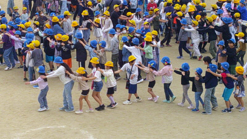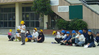 子どもたちの様子を見ていましたが、とてもよくできていました。2年生以上はこれまでの積み重ねですし、1年生もピカピカの防災頭巾で、初めての避難訓練を上手に行えました。