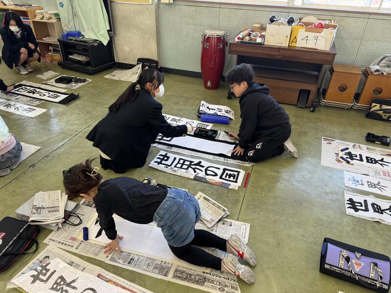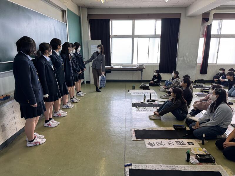 講師は、国分高校書道部の生徒さんたちです。今日期末試験が終わったばかりで、その足で駆けつけてくれました。私は国分高校の文化祭に行って書道部の展示を見ましたがとても上手で、本当に高校生が書いているのかと思ったほどです。