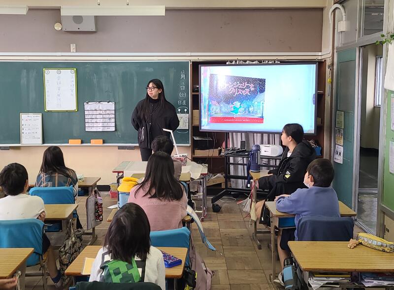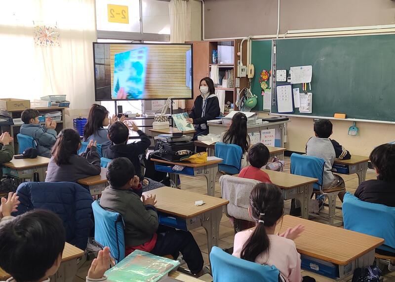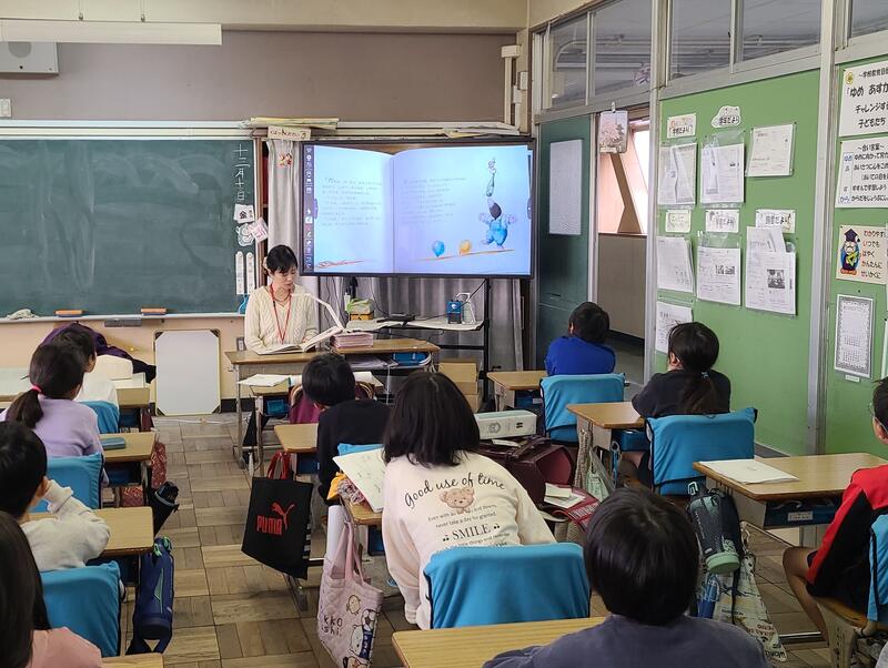 読んでいただく方によって、絵本を実物投影機を使って大型提示装置に大きく映し出したり、子どもたちを前に集めて絵本で読み聞かせをしたりしていただきました。