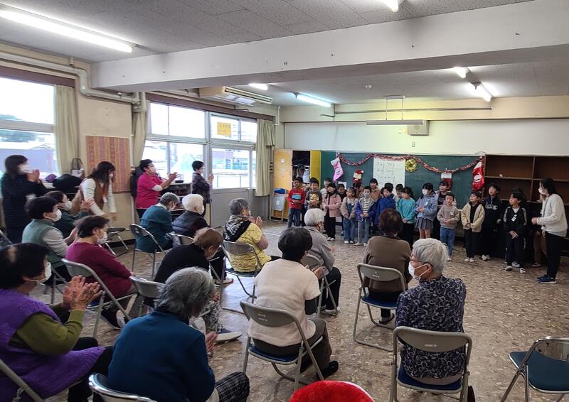 クリスマス会では、①2年生の子どもたちによる歌、②地域の方によるハンドベル、③紙芝居、④歌体操、⑤プレゼントです。