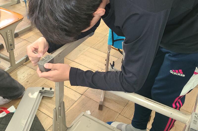 授業で行ったのはオルゴールのふたの部分の制作です。彫刻刀を使って上手に掘り出しています。
