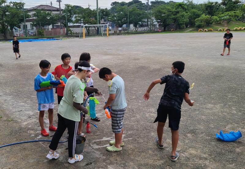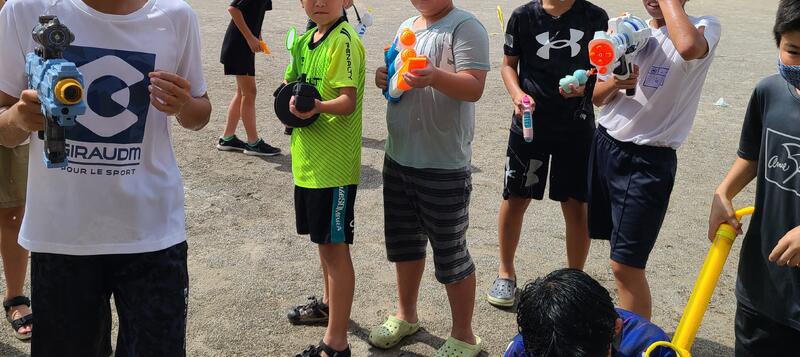 水鉄砲を自宅から持ち寄り、みんなで水を掛け合っていました。