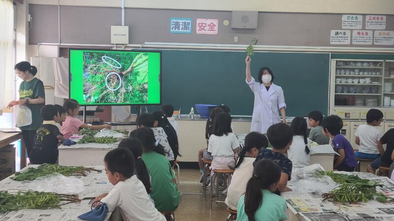 「枝豆がもっと成長するとどうなるかな?」など、1年生の子どもたちは驚きとともに学習しました。