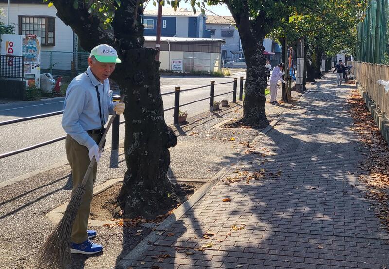 実はこの落ち葉を清掃してくださっている方々がいらっしゃいます。9月~12月の期間、毎週水曜日の8:15~だいたい30分ぐらい掃除をしてくださっています。アクティブシニア、高齢者クラブの方々であり、中心で活動されているのが、本校の前・地域学校協働活動推進員の新福さんです。いつも曽谷小の南側の登校見守りをしてくださっているので、知っている子は多いかと思います。