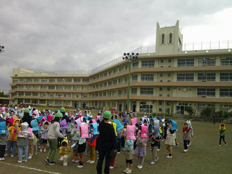 様子を見ていましたが、とてもよくできていました。2年生以上はこれまでの積み重ねですし、1年生もピカピカの防災頭巾で、初めての避難訓練を上手に行えました。