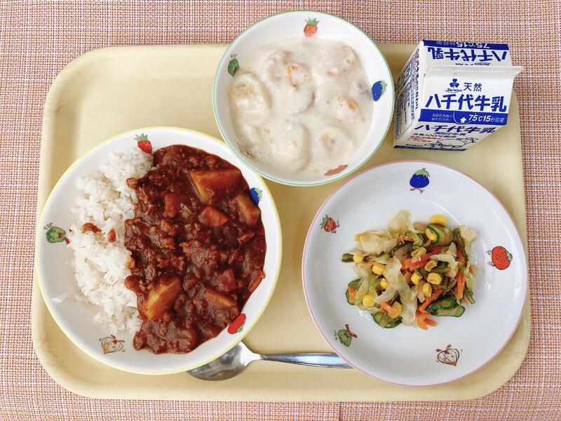 今日は「曽谷小学校給食ランキング」において、人気第4位のカレーライスと、第5位のフルーツポンチの揃い踏みです。実に贅沢な組み合わせです。