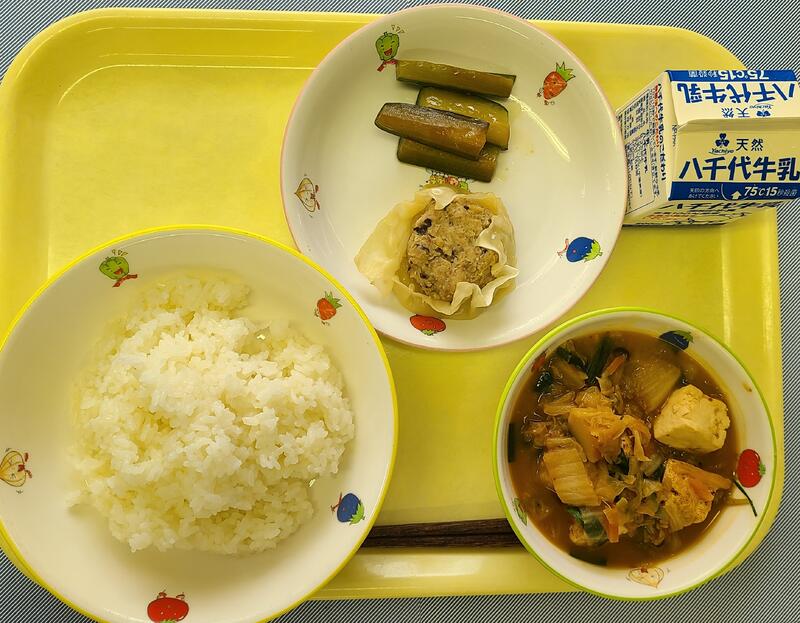 献立は、ご飯、牛乳、手作りシュウマイ、中華きゅうり、あさりのキムチチゲ、です。