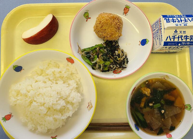 献立は、ご飯、牛乳、里芋のまんまるコロッケ、のり和え、大根のそぼろ汁、りんご、です。