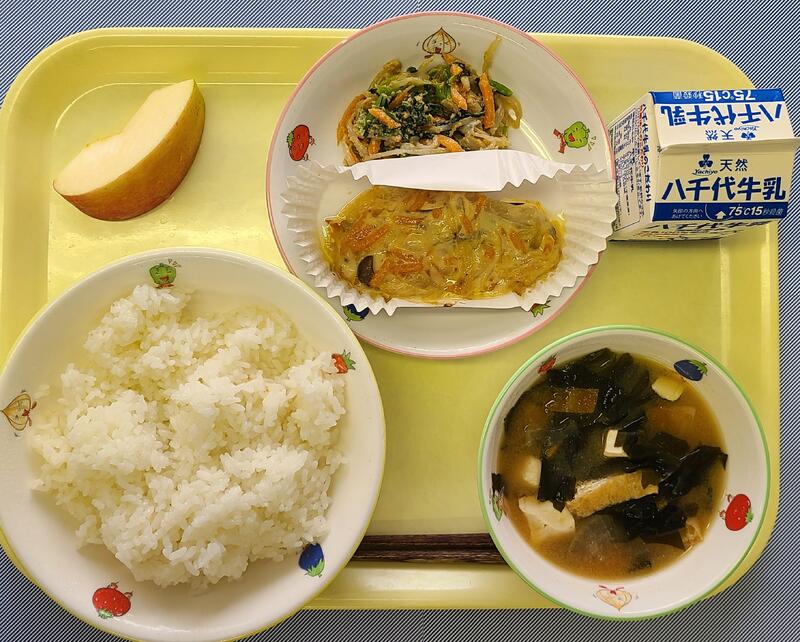 献立は、ご飯、牛乳、鮭の味噌マヨネーズ焼き、小松菜とキャベツのごま和え、豆腐とわかめの味噌汁、りんご、です。