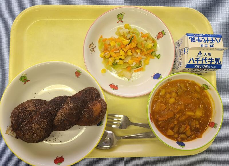 献立は、ココア揚げパン、牛乳、ポークビーンズ、キャベツのサラダ、です。