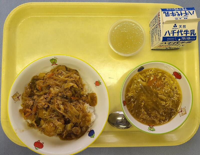 献立は、麦ご飯、牛乳、四川麻婆豆腐丼の具、バンサンスー、餃子アップルパイ、です。