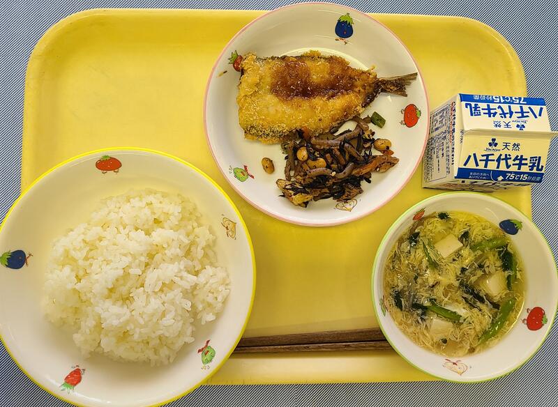 献立は、ご飯、牛乳、鰯フライ、大豆の磯煮、かきたま汁、です。