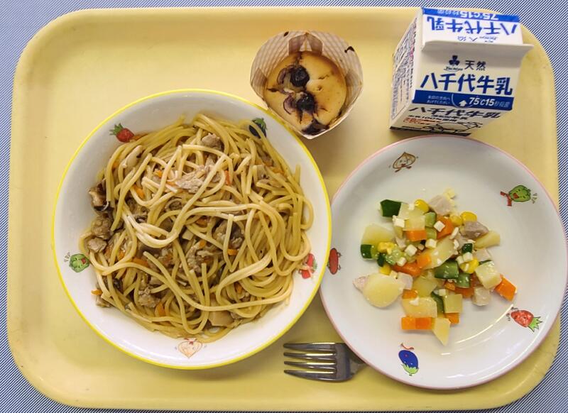 献立は、きのこスパゲティ、牛乳、マセドアンサラダ、ブルーベリーマフィン、です。