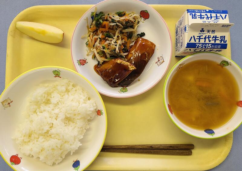 献立は、ご飯、牛乳、いなだの照り焼き、三食おひたし、具だくさん味噌汁、りんご、です。