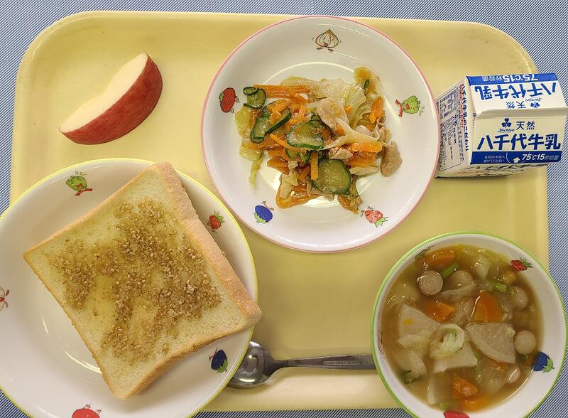 献立は、セサミトースト、牛乳、ポトフ、焼き肉サラダ、りんご、です。