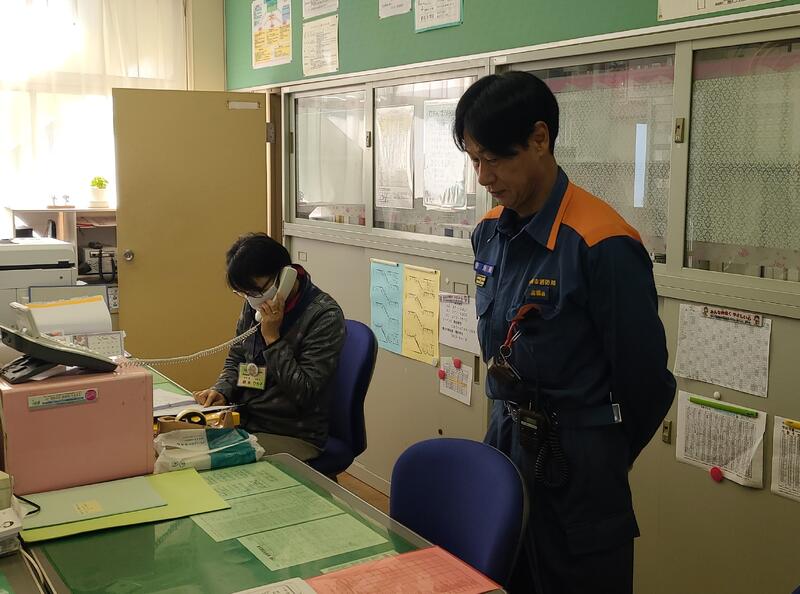 まずはシェイクアウト訓練(まず低く→頭を守り→動かない)を行い、避難経路を再確認しました。今回は事務室からの通報訓練も行いました。実際に消防士の方にも見ていただきました。