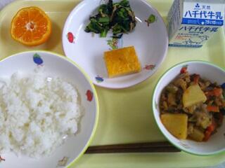 今日はカレーにフルーツポンチと曽谷っ子が好きな献立です。ひじきも食べなれない食材ですが、マリネにすると、あっさり食べやすく、見た目は真っ黒ですが、なれてしまえば、子どもたちもよく食べる献立です。