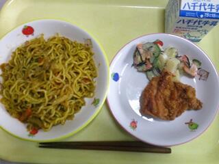 献立:焼きそば 牛乳 鶏のから揚げ ひじポテサラダ