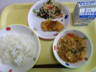 献立:ご飯 牛乳 生揚げの肉みそ煮 タラフライ ごしき和え