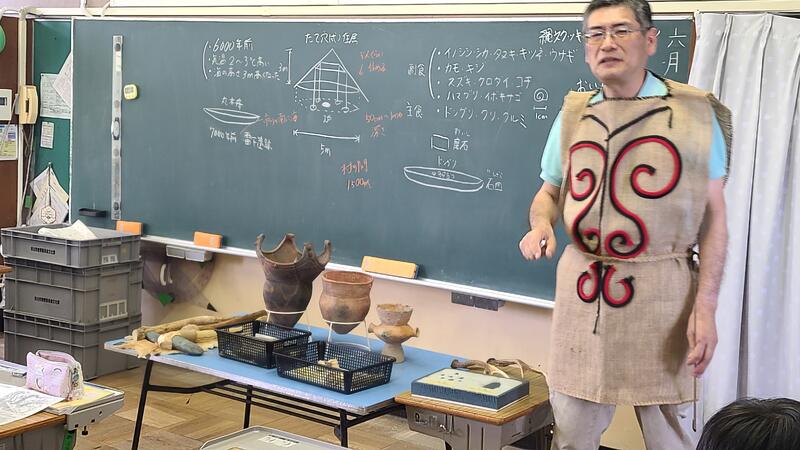 この日はオープンスクールデー。6年生は市川市考古博物館の研究員を講師に迎え、縄文体験の授業を行いました。