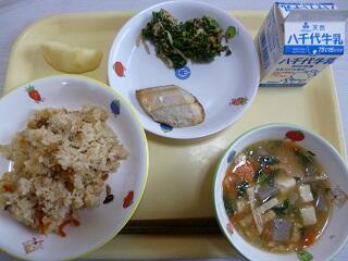 献立:吹き寄せご飯 牛乳 吉野汁 ほっけの一夜干し ごま和え りんご