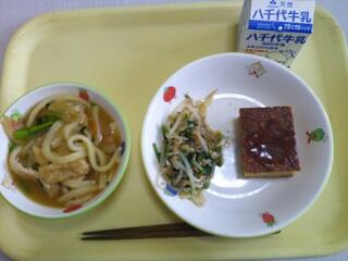 献立:きつねうどん 牛乳 肉みそ和え キャラメルバナナケーキ