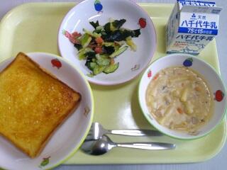 献立:アーモンドトースト 牛乳 秋のシチュー ツナサラダ ぶどうゼリー