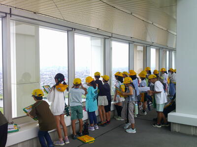 アイリンクタウンの展望台からは、市内ばかりでなく東京も一望できます。先生から出されたお題である江戸川・スカイツリー・総武線・ツインビル・曽谷小・ディズニーシーのプロメテウス火山・東京タワーを必死に探し、見つけると喜んでいました。