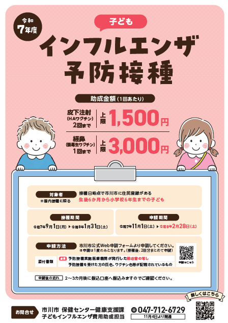 市川市では、今年もインフルエンザ予防接種に対して補助金が出ます。接種を希望される方は、早めの接種をおすすめします。
