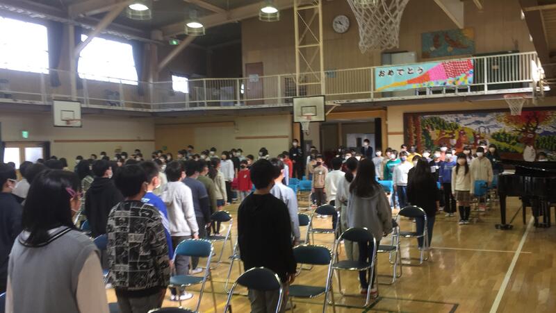 3月24日(金)に、修了式・離任式を行いました。修了式では、修了証書授与、校長先生の話、表彰、生活担当の先生の話がありました。学級活動の後に、体育館で離任式を行いました。