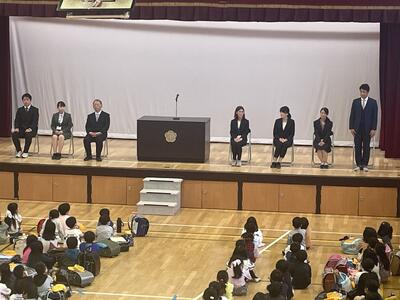 4月7日(金)に体育館で、着任式・始業式を行いました。今年度着任された先生方の紹介と挨拶、新6年生児童代表の歓迎の言葉がありました。代表の生徒は、堂々としていて、とても立派でした。始業式では、学級担任の発表、先生方の紹介、校長先生の話がありました。