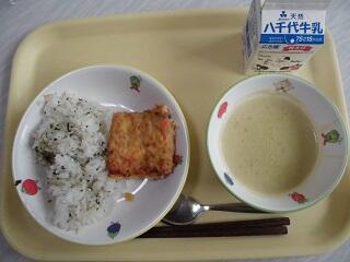 献立: キムチご飯 牛乳 たまごとわかめのスープ 揚げいも