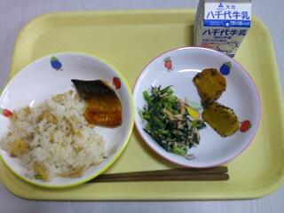 献立:エリンギご飯 牛乳 鯖の幽庵焼き 春菊とひじきとツナの和え物 大学芋